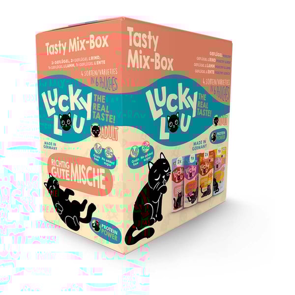 Ihr seht also: Mein Futter gibt es speziell auf unsere verschiedenen Lebensabschnitte und individuellen Bedürfnisse abgestimmt. Langweiligen Einheitsfraß gibt’s woanders – Lucky Lou Lifestage ist in 18 verschiedenen Sorten erhältlich. Damit du deinen Katzen immer frisches Futter servieren kannst, gibt es Lucky Lou Lifestage in Pouchbeuteln mit 125 g Inhalt sowie in Dosen zu 200 g und 400 g. Und Multipacks gibt’s natürlich auch!