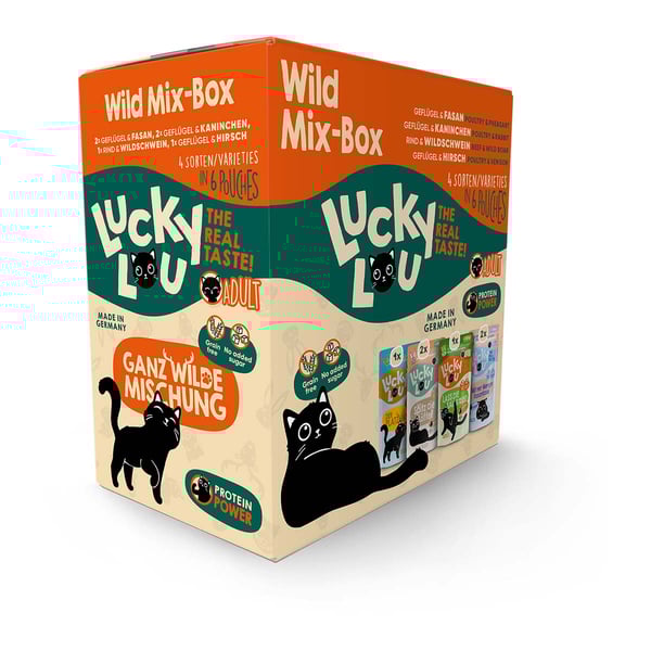Ihr seht also: Mein Futter gibt es speziell auf unsere verschiedenen Lebensabschnitte und individuellen Bedürfnisse abgestimmt. Langweiligen Einheitsfraß gibt’s woanders – Lucky Lou Lifestage ist in 18 verschiedenen Sorten erhältlich. Damit du deinen Katzen immer frisches Futter servieren kannst, gibt es Lucky Lou Lifestage in Pouchbeuteln mit 125 g Inhalt sowie in Dosen zu 200 g und 400 g. Und Multipacks gibt’s natürlich auch!
