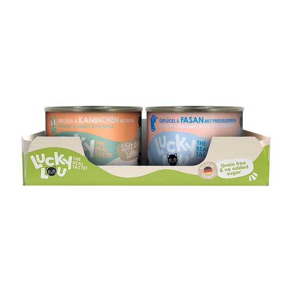 Langweiligen Einheitsfraß gibt’s woanders – Lucky Lou Lifestage ist in 18 verschiedenen Sorten erhältlich. Damit du deinen Katzen immer frisches Futter servieren kannst, gibt es Lucky Lou Lifestage in Pouchbeuteln mit 125 g Inhalt sowie in Dosen zu 200 g und 400 g. Und Multipacks gibt’s natürlich auch!