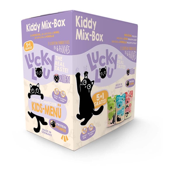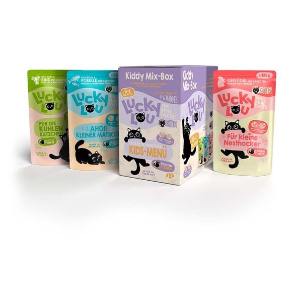 Langweiligen Einheitsfraß gibt’s woanders – Lucky Lou Lifestage ist in 18 verschiedenen Sorten erhältlich. Damit du deinen Katzen immer frisches Futter servieren kannst, gibt es Lucky Lou Lifestage in Pouchbeuteln mit 125 g Inhalt sowie in Dosen zu 200 g und 400 g. Und Multipacks gibt’s natürlich auch!