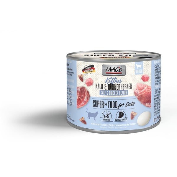 MAC’s Kitten ist eine besonders schmackhafte Komposition aus Kalb und Hühnerherzen und wurde als ausgewogene, getreidefreie Vollnahrung für Kitten entwickelt. Durch das besondere Aminosäureprofil wird Ihr heranwachsender Liebling mit allem versorgt, was er für ein gesundes Wachstum benötigt. Durch schonende Zubereitung und die Zugabe von Vitaminen und Mineralstoffen wird eine naturnahe Ernährung Ihrer jungen Katze erreicht.