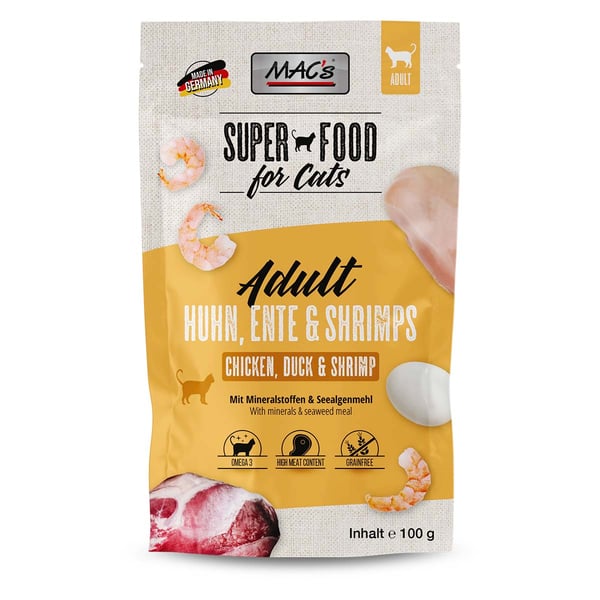 MAC's Huhn, Ente & Shrimps ist die schmackhafte Kombination aus zartem Geflügel und leckeren Meeresfrüchten. Dein Tiger wird es lieben. Die besondere Rezeptur ist getreidefrei und als ausgewogene Vollnahrung entwickelt. Durch schonende Zubereitung und unter Zugabe von Vitaminen und Mineralstoffen wird eine naturnahe Ernährung deiner Katze erreicht.