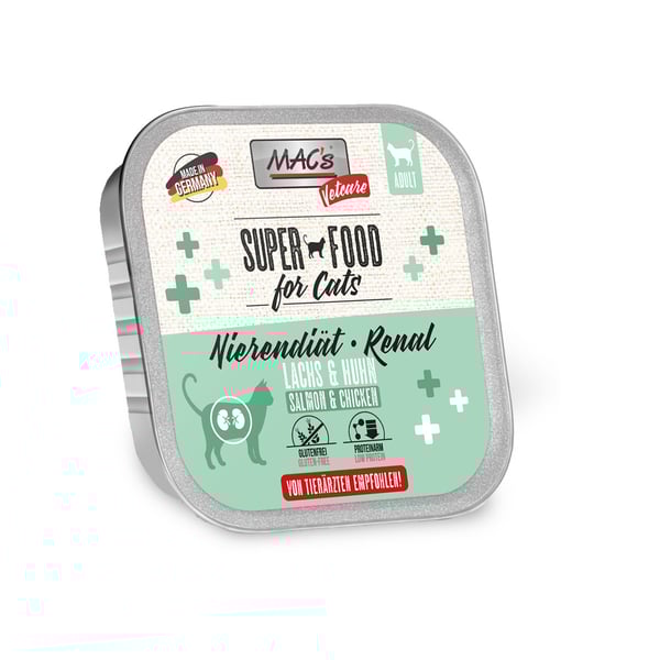MAC's Nierendiät Katze Lachs &Huhn - Unterstützung der Nierenfunktion bei chronischer Niereninsuffizienz. Anwendungsdauer: Zunächst bis zu 6 Monaten, je nach Diätprognose und Krankheitsverlauf muss die Anwendungsdauer mit dem Tierarzt abgestimmt werden.
