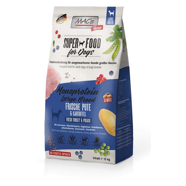 MAC's Dog Monoprotein Large Breed Frische Pute und Kartoffel ist ein hochwertiges Trockenfutter, das speziell zur Fütterung großer Hunderassen entwickelt wurde. Es eignet sich ideal zur täglichen Ernährung ausgewachsener Hunde. Die ausgewogene Rezeptur basiert auf gut verdaulicher Pute, die als einzige tierische Proteinquelle dient. Angereichert ist das Hundefutter unter anderem mit Kartoffeln, Erbsen sowie verschiedenen Beerensorten.