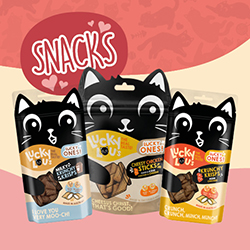 Auf meiner Mission für lucky cats hab‘ ich nämlich meine genialen LUCKY ONES Stix & Cubes entwickelt. Die lustige Truppe sorgt bei Träumern und Abenteurern für extra-Spaß und Genuss. Sie bieten als superfleischige Leckerlis ein abgefahrenes Beute-Feeling. Hinterher fetzen, Beute schnappen und genießen ist ein Riesenspaß für uns Katzen. Für alle die es extra krunchy mögen gibt es meine meine LUCKY ONES Krunchy Krisps mit absolut weltbester Füllung! Wer kann da denn widerstehen? Also ich nicht! Lucky Ones machen Lucky Cats!