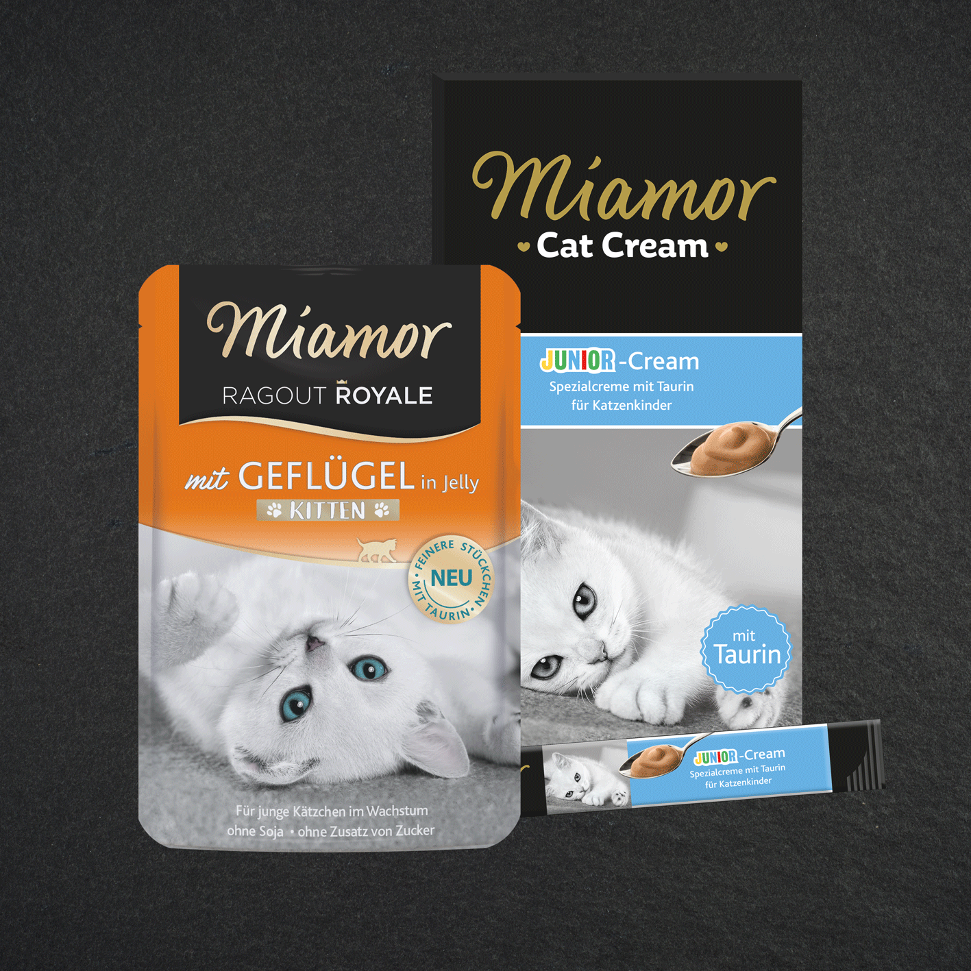 Mit Miamor ist Ihre Katze von Anfang an gut versorgt. Miamor Kitten-Nassfutter wie Ragout Royal und Feine Beute ist auf die speziellen Bedürfnisse junger Katzen abgestimmt und versorgt diese mit wichtigen Nährstoffen.