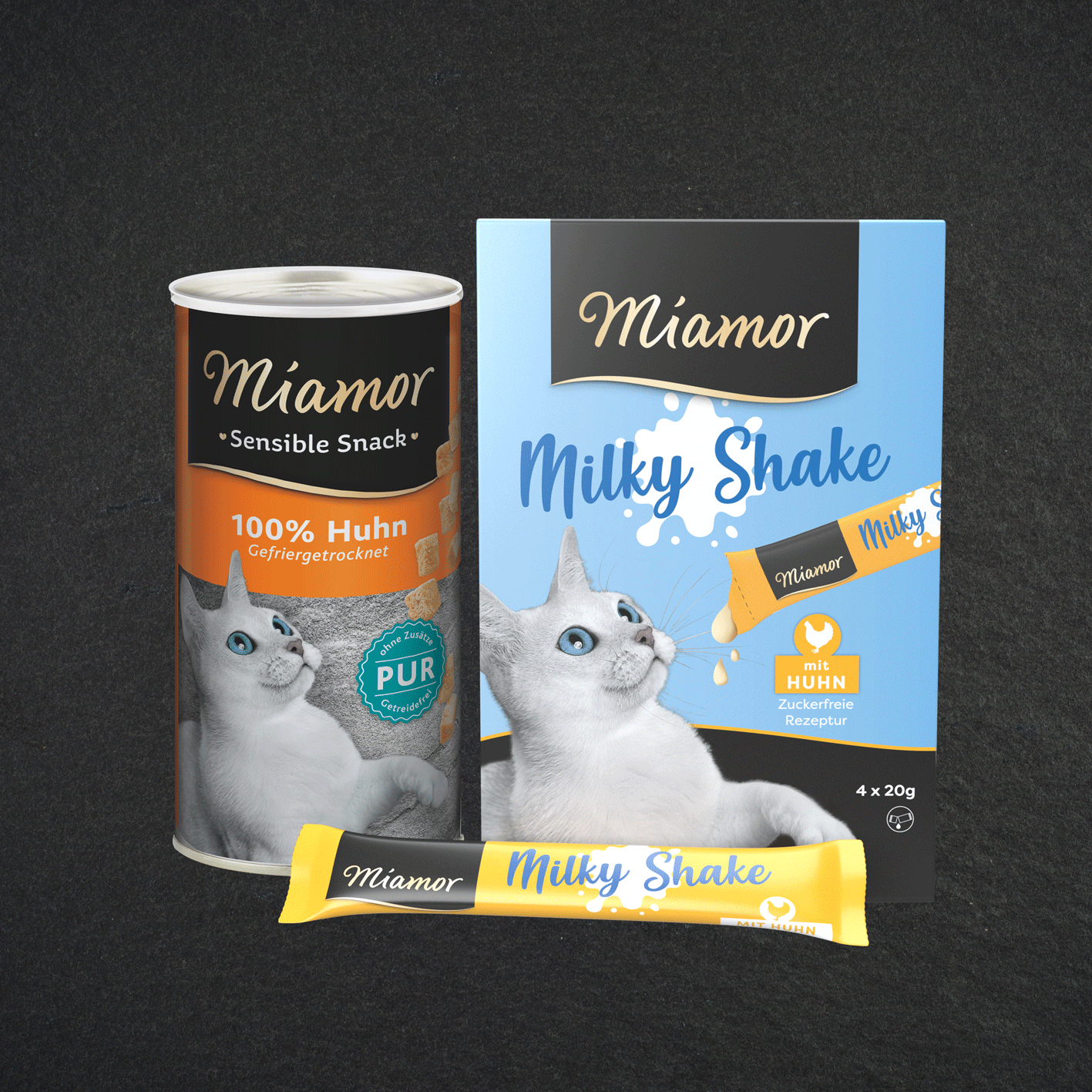 Egal ob knusperleicht oder zum Schlecken – Miamor bietet eine große Auswahl an Snacks, die jedem Stubentiger schmecken. Miamor Sensible Snacks sind pure, gefriergetrocknete Fleischwürfel. Dadurch, dass sie nur aus einer Fleischsorte bestehen, eignen sie sich auch bestens für empfindliche Katzen. Miamor Milky Shakes sind die milchig-leichte Belohnung im Portionsbeutel - natürlich laktosereduziert.