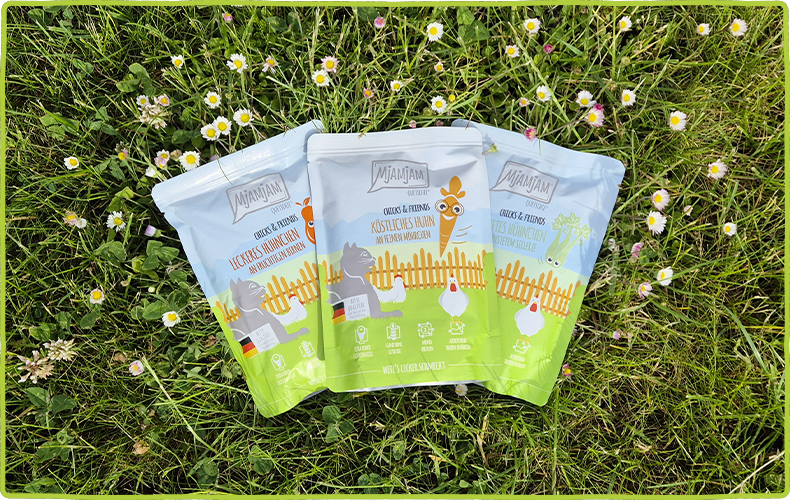 Entdecke die genialen Chicks & Friends – die leckersten Hühnchen-Sorten für glückliche und aktive Samtpfoten. Jede Sorte dieser Linie kombiniert saftiges Hühnchen mit köstlichem Gemüse oder Obst wie Spinat, Apfel, Erdbeere, Zucchini, Sellerie, Birne und Brokkoli. Schmeckt zum Schnurren lecker. Die ausgewogenen Mahlzeiten sind getreidefrei, reich an Fleisch und voller Vitamine sowie Nährstoffe. Ideal für Katzenbesitzer, die nur das Beste für ihre Lieblinge wollen. Gönne deiner Katze ein geschmackliches Abenteuer und unterstütze gleichzeitig ihre Fitness. MjAMjAM – weil deine Katze es wert ist!