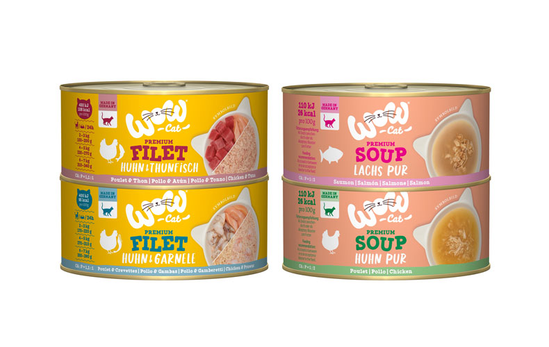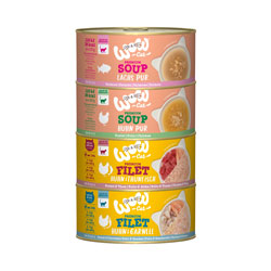Zarte Filetstücke in natürlichem Saft bringen selbst wählerische Samtpfoten zum Schnurren – genauso wie feinschmeckende Suppen, bestehend aus intensiver Hühner- oder Lachsbrühe mit zarten Filetstückchen. Die ideale Ergänzung als Snack zwischendurch oder als Akzeptanz-Booster übers Futter.
