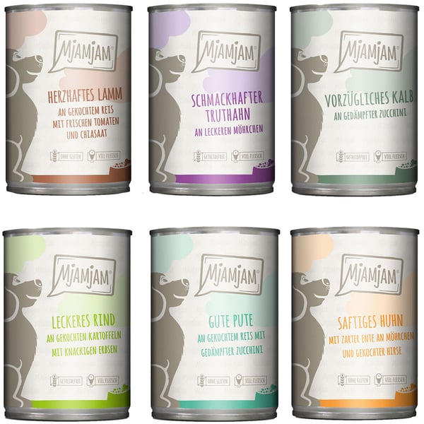 Das MjAMjAM Mixpaket II mit Huhn&Ente, Rind, Pute, Kalb, Truthahn, Lamm 6x400g bietet deinem Hund eine abwechslungsreiche Ernährung. Es enthält vorzügliches Kalb an gedämpfter Zucchini, schmackhaften Truthahn an leckeren Möhrchen, herzhaftes Lamm an gekochtem Reis mit frischen Tomaten und Chiasaat, saftiges Huhn mit zarter Ente an Möhrchen und gekochter Hirse, gute Pute an gekochtem Reis mit gedämpfter Zucchini und leckeres Rind an gekochten Kartoffeln mit knackigen Erbsen.