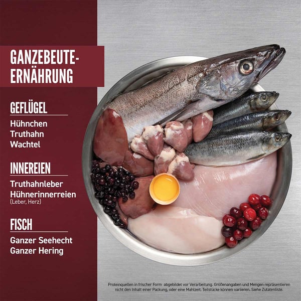 Rohes Truthahnfleisch (19%), frisches Hühnerfleisch (18,5%), rohe Wachtel (4%), roher ganzer Hecht (4%), roher ganzer Hering (4%), rohe Truthahnleber (4%), frische Hühnerinnereien (Leber, Herz) (4%), frische Eier (4%), getrocknetes Hühnerprotein (4%), getrocknetes Truthahnprotein (4%), getrockneter Hering (4%), getrocknete Hühnerleber (4%), frische Eier (4%), ganze rote Linsen, ganze Wachtelbohnen, ganze grüne Linsen, Hühnerfett (3%), ganze weiße Bohnen, ganze Kichererbsen, Linsensamen, ganze Erbsen, Seelachsöl (0,5%), Erbsenstärke, getrockneter Seetang, neuseeländische Grünlippmuscheln, frischer ganzer Butternusskürbis, frische ganze Karotten, frische ganze Birnen, frische ganze Zucchini, getrocknete Zichorienwurzel, frische Rote-Bete-Blätter, frischer Grünkohl, frischer Spinat, frische Radieschenblätter, ganze Cranberries, ganze Heidelbeeren, ganze Saskatoon-Beeren, Kurkuma, Mariendistel, Klettenwurzel, Lavendel, Eibischwurzel, Hagebutte