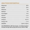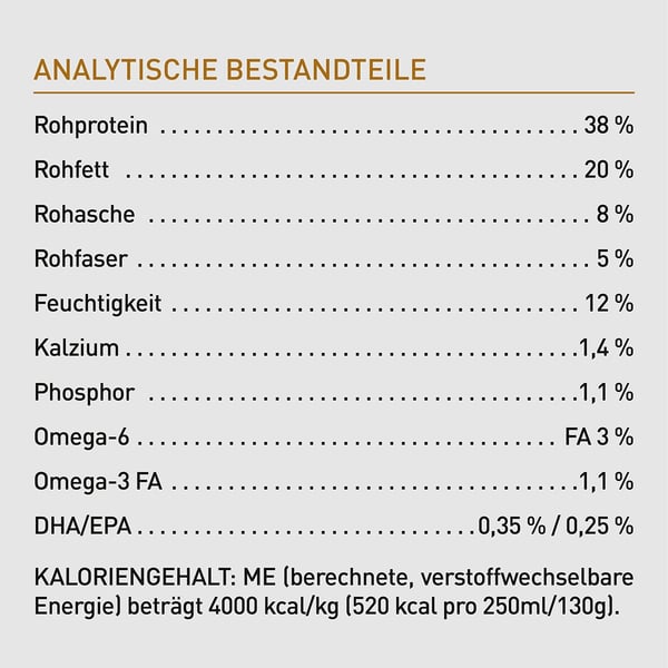 Analytische Bestandteile:Rohprotein 38 %, Rohfett 20 %, Rohasche 8 %, Rohfaser 5 %, Feuchtigkeit 12 %, Kalzium 1,4 %, Phosphor 1,1 %, Omega-6 FA 3 %, Omega-3 FA 1,1 %, DHA/EPA 0,35 % / 0,25 %