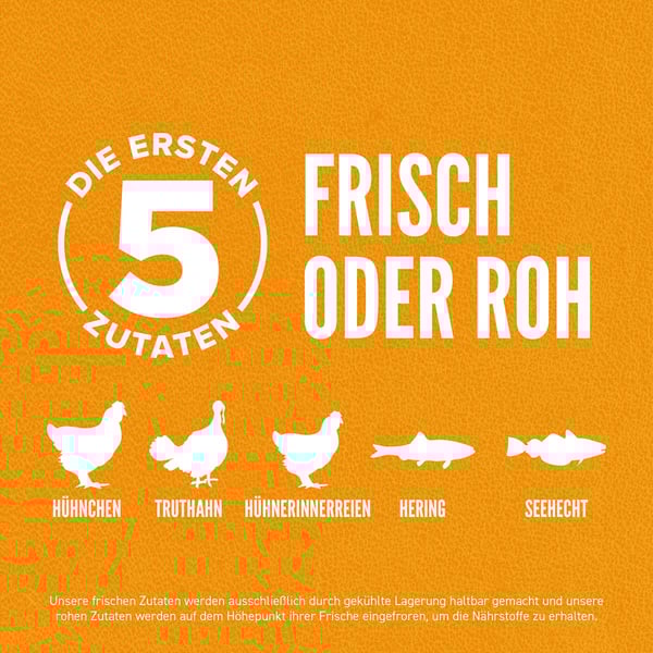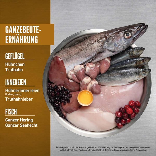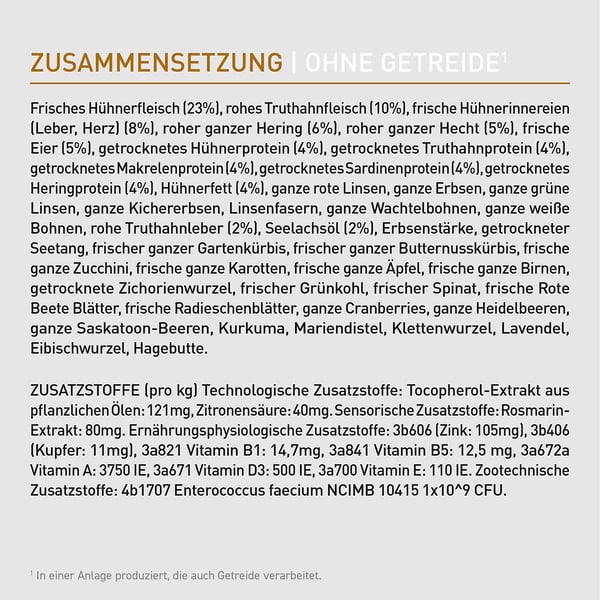 Frisches Hühnerfleisch (23%), rohes Truthahnfleisch (10%), frische Hühnerinnereien (Leber, Herz) (8%), roher ganzer Hering (6%), roher ganzer Hecht (5%), frische Eier (5%), getrocknetes Hühnerprotein (4%), getrocknetes Truthahnprotein (4%), getrocknetes Makrelenprotein (4%), getrocknetes Sardinenprotein (4%), getrocknetes Heringprotein (4%), Hühnerfett (4%), ganze rote Linsen, ganze Erbsen, ganze grüne Linsen, ganze Kichererbsen, Linsenfasern, ganze Wachtelbohnen, ganze weiße Bohnen, rohe Truthahnleber (2%), Seelachsöl (2%), Erbsenstärke, getrockneter Seetang, frischer ganzer Gartenkürbis, frischer ganzer Butternusskürbis, frische ganze Zucchini, frische ganze Karotten, frische ganze Äpfel, frische ganze Birnen, getrocknete Zichorienwurzel, frischer Grünkohl, frischer Spinat, frische Rote Beete Blätter, frische Radieschenblätter, ganze Cranberries, ganze Heidelbeeren, ganze Saskatoon-Beeren, Kurkuma, Mariendistel, Klettenwurzel, Lavendel, Eibischwurzel, Hagebutte
