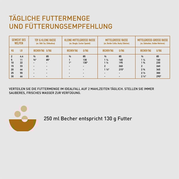 | Gewicht des Welpen | kleine Rassen | kleine bis mittelgroße Rassen | mittelgroße Rassen | mittelgroße bis Große Rassen |