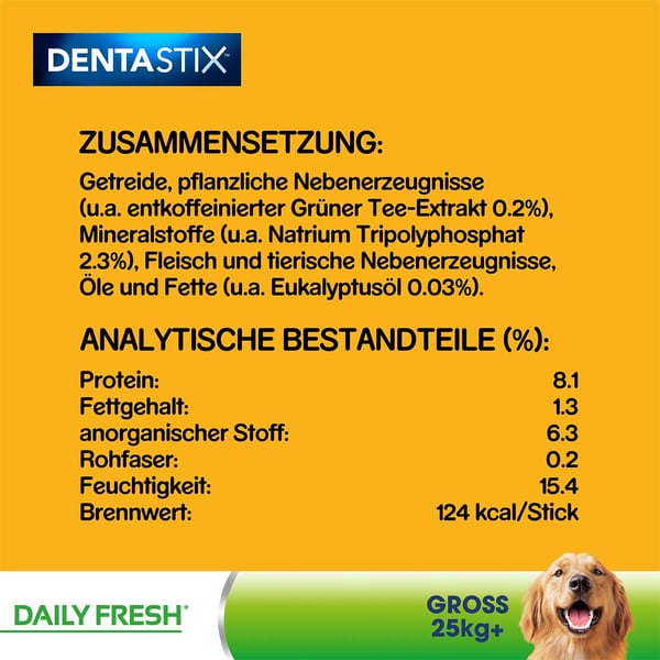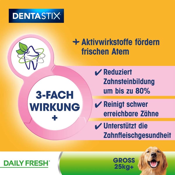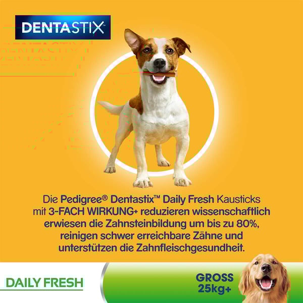 Die speziellen Kauknochen für die tägliche sind einzigartige X-förmige Zahnpflegeprodukte, die wissenschaftlich erwiesen dazu beitragen, die Bildung von Zahnstein bei täglicher Fütterung um bis zu 80% zu reduzieren. Pedigree DentaStix Daily Fresh enthalten eine einzigartige Wirkstoffmischung aus Grüntee-Extrakt und patentiertem Eukalyptusöl, die nachweislich helfen, den Atem zu erfrischen.
