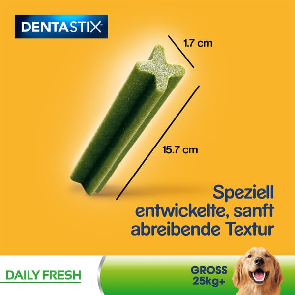 Große Feinschmecker werden mit den Pedigree DentaStix Daily Fresh voll auf ihre Kosten kommen. Wenn du die Zähne deines Hundes sauber halten und ihm gleichzeitig einen leckeren Snack gönnen willst, sind Pedigree DentaStix Daily Fresh ideal für beides geeignet. Die Zähne sind das wichtigste Werkzeug für deinen Hund. Mit schmerzenden Zähnen kann er nur eingeschränkt kauen. Daher solltest du ein besonderes Augenmerk auf seine Zahnpflege legen. Die Zahngesundheit kann durch diesen Hundesnack positiv beeinflusst werden. Der Snack ist für Hunde aller Lebensphasen geeignet.
