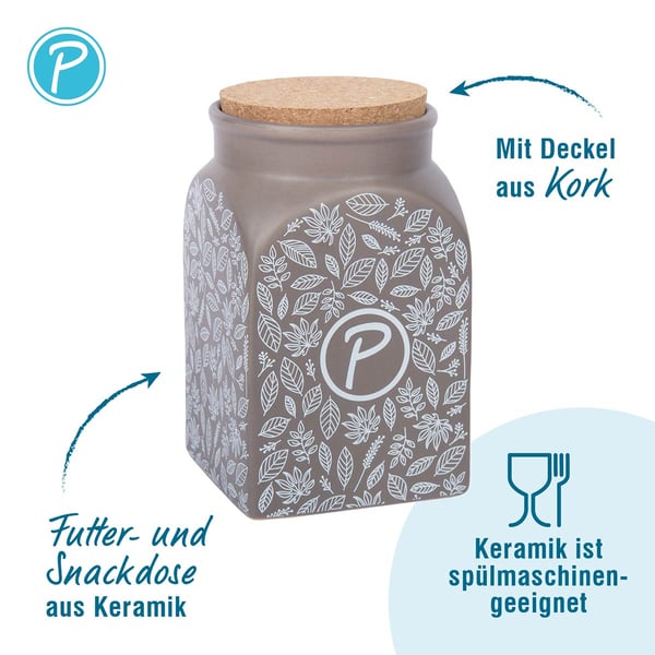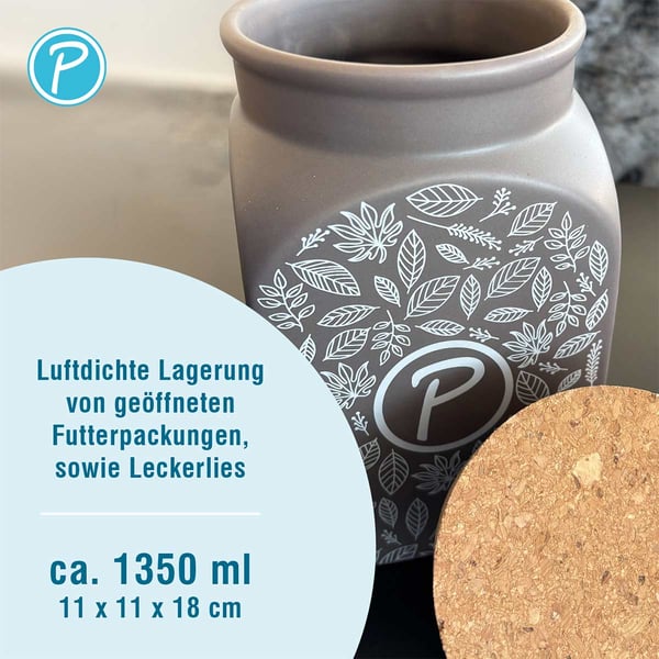 Die Petlando Futter- und Snackdose Leaf taupe bietet eine stilvolle und funktionale Lösung für die Aufbewahrung von Futter und Leckerlies. Hergestellt aus hochwertiger Keramik, ist diese Dose nicht nur robust, sondern auch ein echter Blickfang. Der Deckel aus Kork sorgt dafür, dass der Inhalt luftdicht verschlossen bleibt und somit frisch und aromatisch bleibt.
