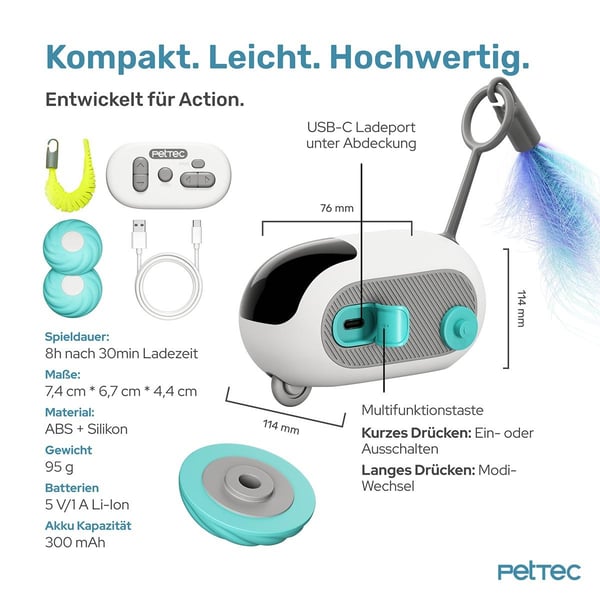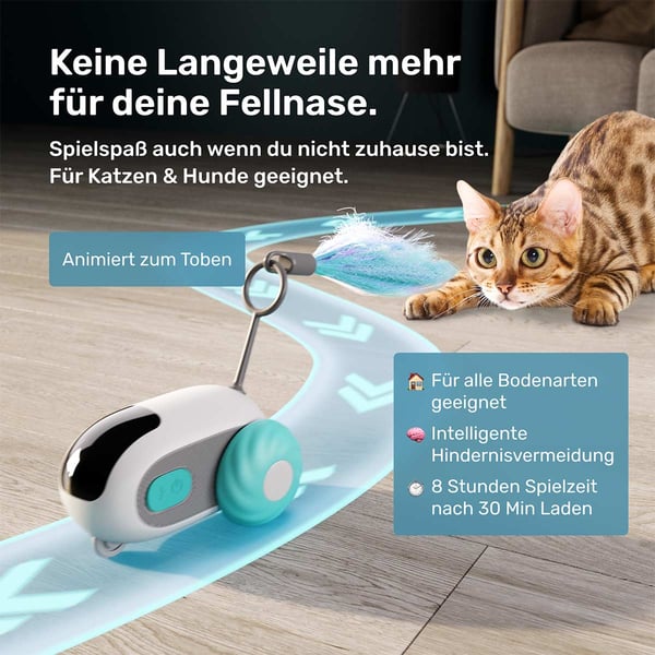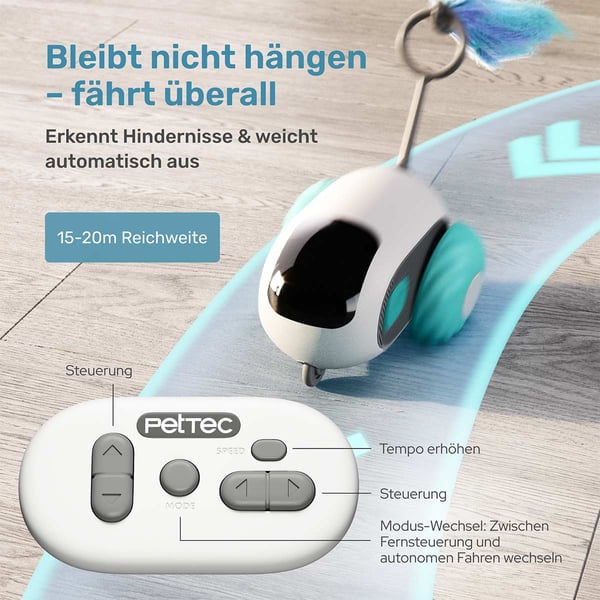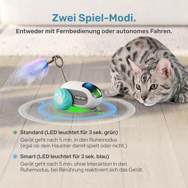 Das PetTec RC Auto bietet deiner Katze eine spannende Möglichkeit, ihren Spieltrieb auszuleben. Mit der Option, das Auto per Fernbedienung zu steuern oder es autonom durch die Wohnung fahren zu lassen, wird für abwechslungsreiche Unterhaltung gesorgt. Diese Flexibilität macht das Spielzeug ideal für Katzen, die gerne jagen und toben.