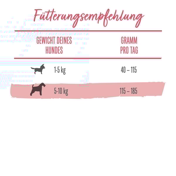 Die angegebenen Mengen beziehen sich auf mäßig aktive Hunde unter normalen Umgebungstemperaturen. Da der individuelle Bedarf schwankt, sollte die Futtermenge derart angepasst werden, dass dein Hund ein schlankes und gesundes Körpergewicht beibehält. Frisches, sauberes Trinkwasser sollte stets verfügbar sein.