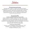 Zusatzstoffe:Vitamin A 20000 IE/kg, Vitamin D3 1100 IE/kg, Vitamin E 95 IE/kg, Eisen-(II)-sulfat Monohydrat (Fe) 83 mg/kg, Calciumjodat, wasserfrei (I) 2 mg/kg, Kupfer-(II)-sulfat Pentahydrat (Cu) 9,2 mg/kg, Mangansulfat Monohydrat (Mn) 6,3 mg/kg, Zinksulfat Monohydrat (Zn) 120 mg/kg, Natriumselenit (Se) 0,2 mg/kg, Antioxidantien vorhanden, Farbstoffe ohne hinzugefügte Farbstoffe, Konservierungsstoffe vorhanden
