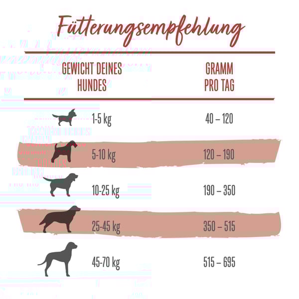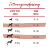 Die angegebenen Mengen beziehen sich auf mäßig aktive Hunde unter normalen Umgebungstemperaturen. Da der individuelle Bedarf schwankt, sollte die Futtermenge derart angepasst werden, dass dein Hund ein schlankes und gesundes Körpergewicht beibehält. Frisches, sauberes Trinkwasser sollte stets verfügbar sein.