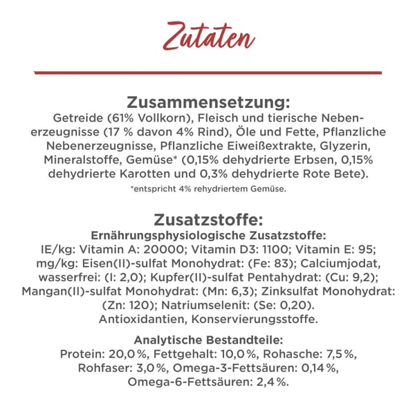 Getreide (61% Vollkorn), Fleisch und tierische Nebenerzeugnisse (17 % davon 4% Rind), Öle und Fette, Pflanzliche Nebenerzeugnisse, Pflanzliche Eiweißextrakte, Glyzerin, Mineralstoffe, Gemüse* (0,15% dehydrierte Erbsen, 0,15% dehydrierte Karotten und 0,3% dehydrierte Rote Bete). *entspricht 4% rehydriertem Gemüse.