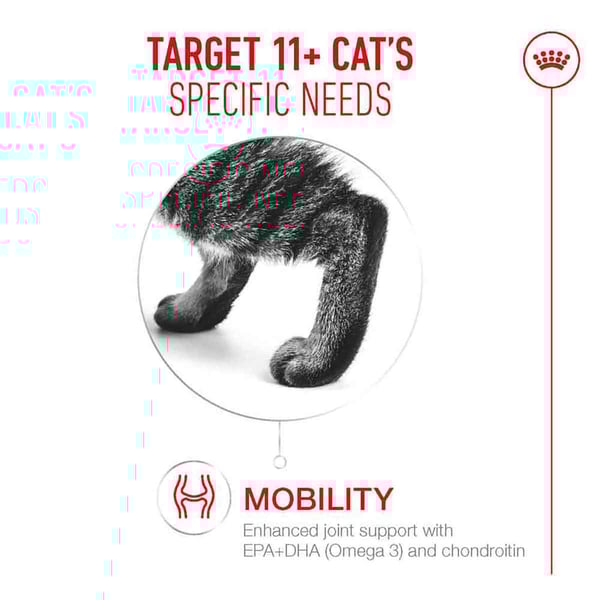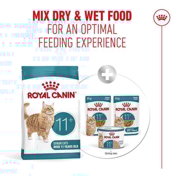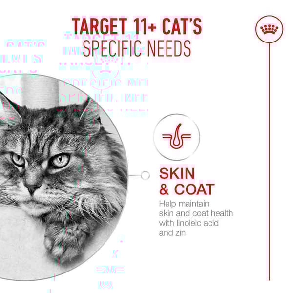 ROYAL CANIN AGEING 11+ wurde für Senior Katzen entwickelt und von ihnen getestet. Es enthält leicht zu kauende Kroketten, um Ihrer Katze ein angenehmes Fütterungserlebnis zu bieten.