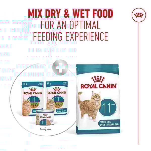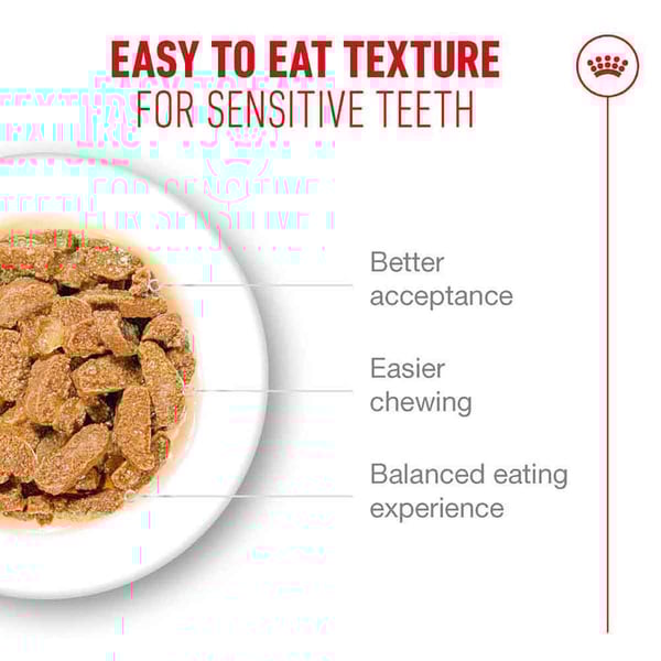 ROYAL CANIN AGEING 11+ ist in verschiedenen Texturen erhältlich, darunter Stückchen in Soße, besonders weiche Mousse und als Trockennahrung.