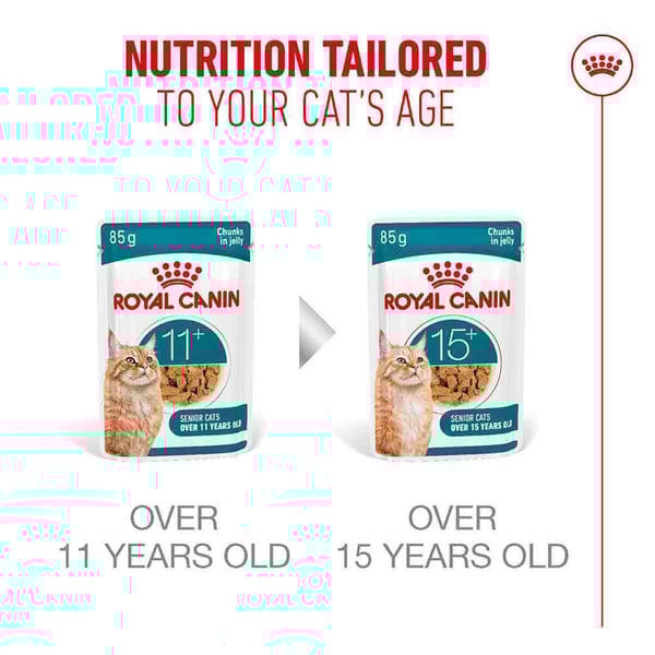 ROYAL CANIN AGEING 11+ Stückchen in Gelee wurde für Senior Katzen entwickelt und von ihnen getestet. Es hat eine leicht zu kauende Textur, um Ihrer Katze ein angenehmes Fütterungserlebnis zu bieten.
