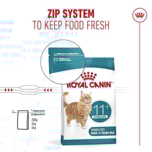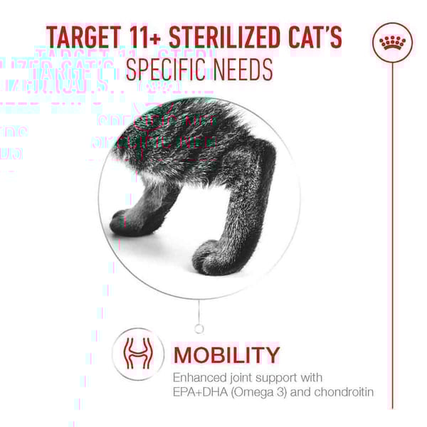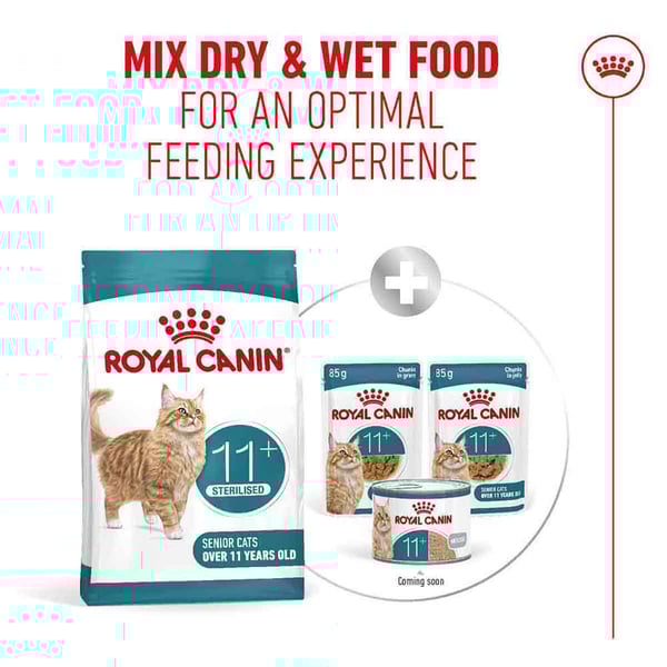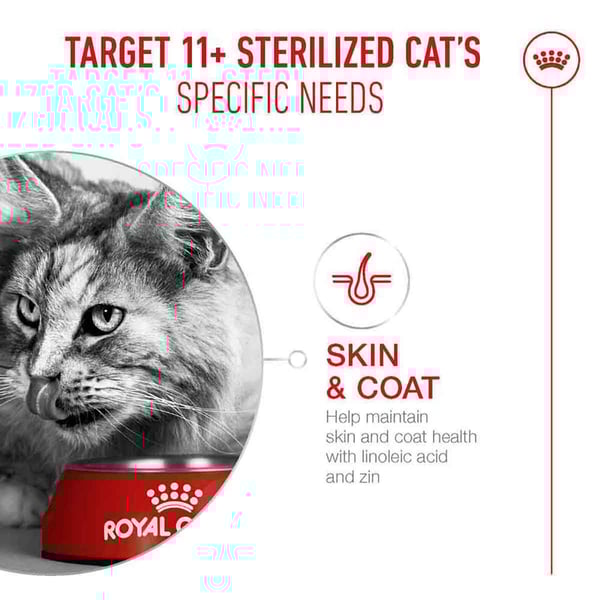 ROYAL CANIN AGEING 11+ STERILISED wurde für Senior Katzen entwickelt und von ihnen getestet. Es enthält leicht zu kauende Kroketten, um Ihrer Katze ein angenehmes Fütterungserlebnis zu bieten.