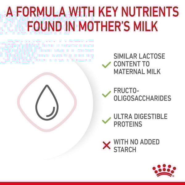 ROYAL CANIN® Babycat Milk kommt der Muttermilch sehr nahe. Das Mikrogranulat stellt sicher, dass es sich in nur fünf Sekunden auflöst und so eine klumpenfreie Zubereitung ermöglicht. Sorgfältig ausgewählte und hoch verdauliche Proteine unterstützen ein gesundes Verdauungssystem. Die Zugabe von Fructo-Oligosacchariden (FOS) hilft, ein gesundes Gleichgewicht der Darmflora zu erhalten. Ein Antioxidantienkomplex (Vitamin E und C, Lutein, Taurin) und Mannan-Oligosaccharide unterstützen die sich entwickelnden Abwehrkräfte des Kätzchens.