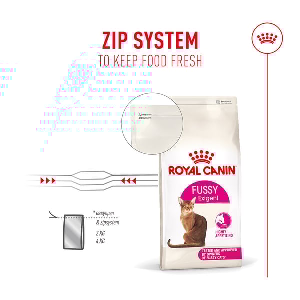 Um wählerischen Katzen eine Ernährung mit maximalem Geschmack zu bieten, kombiniert die Fussy-Rezeptur unsere 3 früheren Exigent-Rezepturen – Savour, Aroma und Protein – in einem Produkt: ROYAL CANIN Fussy.
