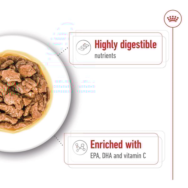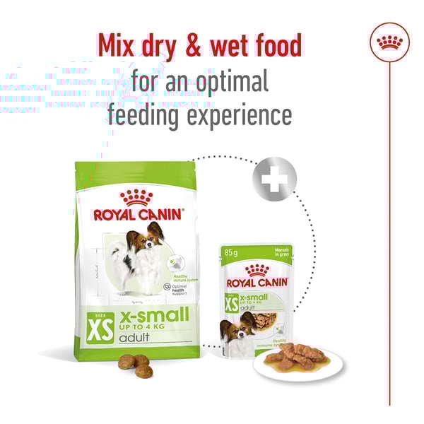 ROYAL CANIN® X-Small Adult Häppchen in Soße ist eine nährstoffreiche und ausgewogene Feuchtnahrung, die den spezifischen Bedürfnissen Ihres sehr kleinen Hundes gerecht wird und ihn im Erwachsenenalter unterstützt. Diese Nahrung eignet sich für sehr kleine, bis 4 kg schwere Hunde ab 10 Monaten. Die nährstoffreiche Rezeptur enthält essenzielle Nährstoffe wie EPA, DHA und Vitamin C und ist darauf ausgerichtet, die körpereigenen Abwehrkräfte und die Gesundheit Ihres Hundes zu fördern. In diesem Lebensabschnitt braucht Ihr sehr kleiner Hund spezifische Nährstoffe, damit er aktiv, gesund und voller Lebensfreude bleibt. Die Rezeptur ist mit hochverdaulichen Nährstoffen für die bestmögliche Aufnahme angereichert und fördert die Gesundheit optimal. Egal, welcher Rasse Ihr Hund angehört, sein Fell ist die Krönung seiner Erscheinung. Diese mit einer Nährstoffmischung angereicherte Feuchtnahrung unterstützt den Erhalt einer gesunden Haut und eines glänzenden Fells. ROYAL CANIN® X-Small Adult Häppchen in Soße gibt es auch als Kroketten: © ROYAL CANIN® X-Small Adult. Die Mischfütterung aus Feucht- und Trockennahrung verleiht der Ernährung Ihres Hundes Abwechslung und ermöglicht ihm verschiedene Geschmackserlebnisse.