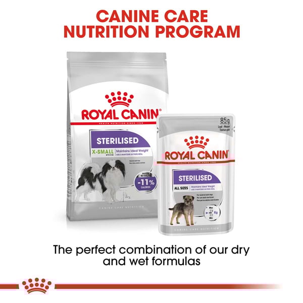 ROYAL CANIN® Sterilised X-Small ist nachgewiesenermaßen ein erfolgreiches Futter zur Vermeidung einer Gewichtszunahme: Es beinhaltet 11% weniger Kalorien als herkömmliches Futter für ausgewachsene Hunde.