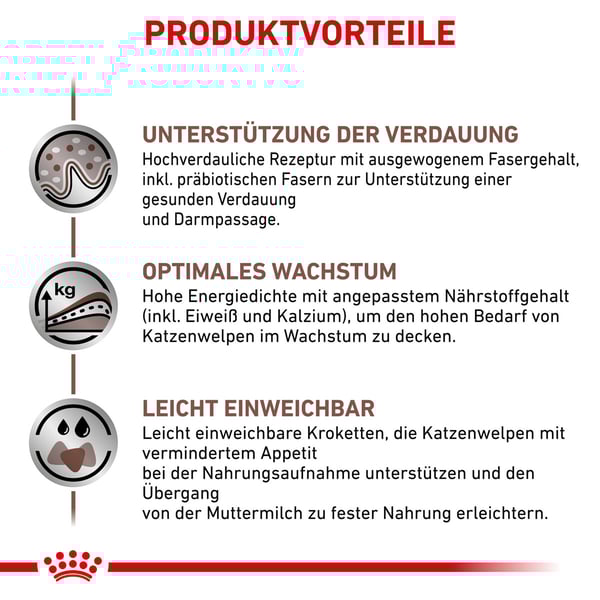 Diese energiereiche Rezeptur enthält geeignete Mengen an Nährstoffen wie Eiweiß und Kalzium, die ein heranwachsendes Kätzchen braucht, um den Nährstoffbedarf für eine gesunde Entwicklung zu decken.