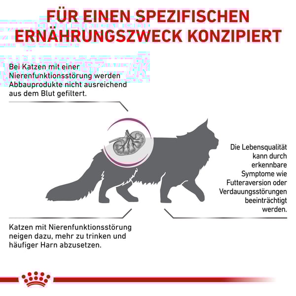 ROYAL CANIN Renal Select ist eine ausgewogene und nährstoffreiche Rezeptur, die speziell dazu entwickelt wurde, die Nieren deiner Katze bei einer Nierenfunktionsschwäche zu unterstützen.
