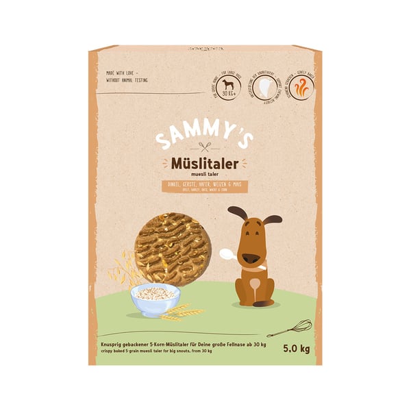 Knackiges Vollkorn, vollmundiger Mais, kräftiges Weizen- und Dinkelmehl und zarte Haferflocken sind Sammy's Zutaten für seinen Müslitaler. Die hochwertige 5-Korn-Mischung wird in alter Backtradition behutsam verknetet und schonend im Ofen gebacken. Unverwechselbar mit der goldbraunen Kruste ist unser 5-Korn-Müslitaler besonders hart und knusprig, damit Deine große Fellnase auch morgen noch kraftvoll zubeißen kann.
