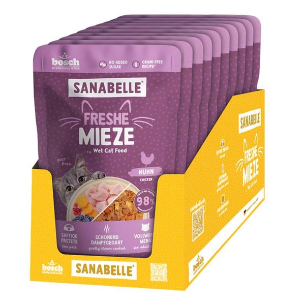 Sanabelle Freshe Mieze Huhn bietet deiner Katze ein vollwertiges Alleinfutter, das speziell für ausgewachsene Katzen ab dem 12. Lebensmonat entwickelt wurde. Mit einem hohen Anteil an frischem Huhn und nährstoffreichen Innereien ist es ideal für Katzen, die eine getreidefreie Ernährung bevorzugen. Die Rezeptur ist frei von Zucker und Getreide, was es besonders bekömmlich macht.