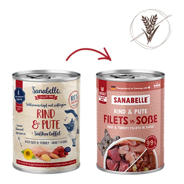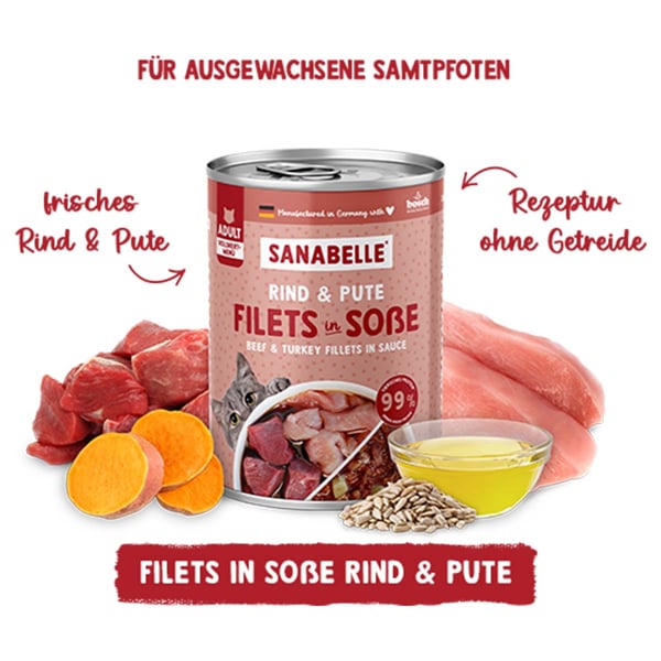 Sanabelle Adult mit saftigem Rind + Pute mit Süßkartoffel + Sonnenblumenöl ist ein Alleinfutter für ausgewachsene Katzen in All-Meat Qualität in feiner Soße.