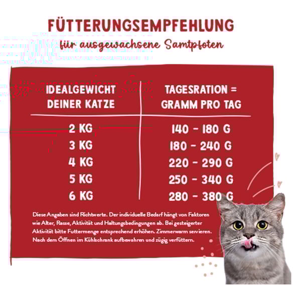 Idealgewicht der ausgewachsenen Katze / Gramm pro Tag