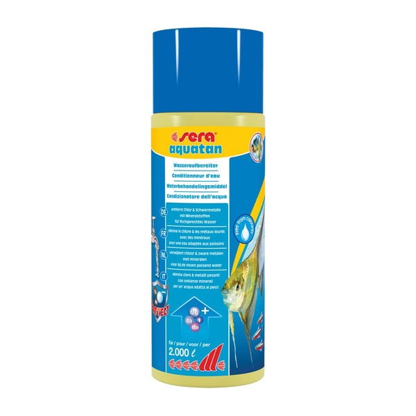 Ein Teil des Aquarienwassers muss in regelmäßigen Abständen gewechselt werden, damit sich die Tiere und Pflanzen im Becken wohl fühlen und gesund bleiben. In der Regel wird bei einem Wasserwechsel herkömmliches Leitungswasser verwendet. Für uns Menschen ist das Leitungswasser unbedenklich, da es mit modernsten Mitteln aufbereitet wird und somit als Trinkwasser bestens geeignet ist. Doch Trinkwasser ist kein Aquarienwasser: Für die Aquarienbewohner schädliche Stoffe wie beispielweise Chlor oder Schwermetalle können - trotz moderner Trinkwasseraufbereitung - immer noch in für die Tiere kritischen Konzentrationen vorhanden sein. Mit dem Wasseraufbereiter sera aquatan wird das Leitungswasser zuverlässig in kürzester Zeit zu fischgerechtem Wasser aufbereitet. Es entfernt Chlor und Chloramine, bindet Schwermetalle wie Kupfer, Zink oder Blei, schützt vor Ammoniak und fügt dem Wasser nun gleichzeitig auch wichtige Mineralstoffe in bioverfügbarer Form hinzu, von denen Fische, Pflanzen, Wirbellose und nützliche Mikroorganismen profitieren. Dazu zählen:
