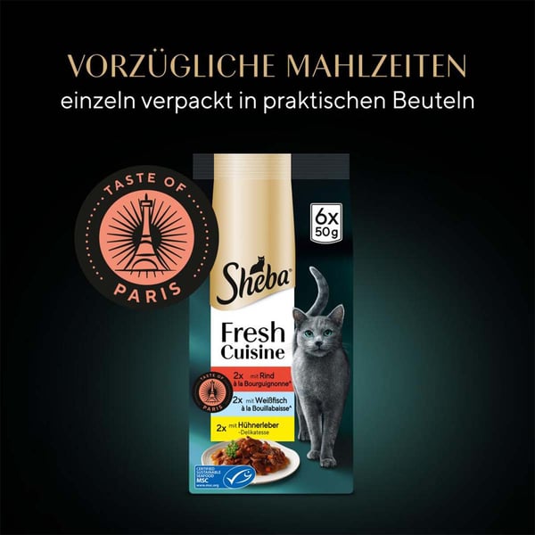 Mit Sheba Fresh Cuisine Taste of Paris bringst du den Flair der französischen Metropole in den Napf deiner Katze. Die sorgfältig ausgewählten Zutaten versprechen eine hochwertige Mahlzeit, die ohne künstliche Farb- und Konservierungsstoffe auskommt. So genießt deine Katze jeden Tag eine nahrhafte und schmackhafte Kost.