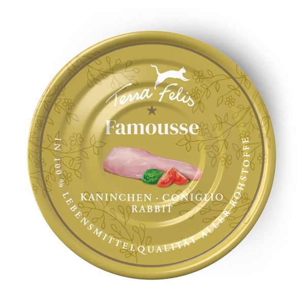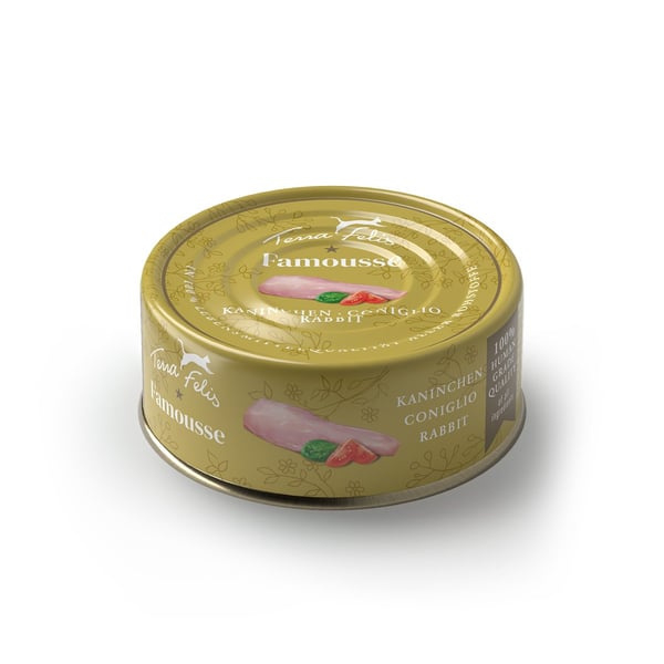 Terra Felis Famousse Kaninchen setzt neue Standards in der Katzenernährung. Mit über 90% frischem Muskelfleisch, wertvollen Innereien und samtiger Brühe ist es perfekt auf die natürlichen Bedürfnisse von Katzen abgestimmt. Alle Rohstoffe sind in 100% Lebensmittelqualität, was für ein natürlich frisches Aroma sorgt. Diese Qualität überzeugt selbst wählerische Katzen.