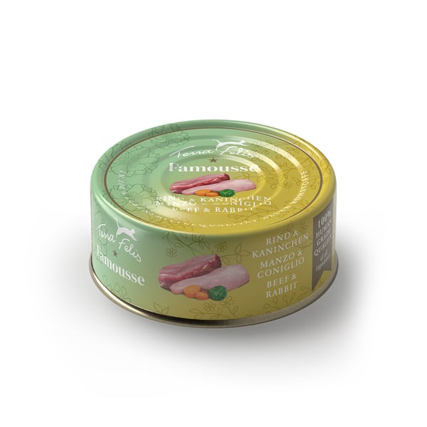 Terra Felis Famousse Rind & Kaninchen wird aus Rohstoffen in 100% Lebensmittelqualität hergestellt. Die spezielle Rezeptur enthält über 90% frisches Muskelfleisch und wertvolle Innereien, die perfekt auf die natürlichen Bedürfnisse von Katzen abgestimmt sind. Diese hochwertige Zusammensetzung sorgt für ein unverwechselbares Aroma, das Katzen lieben.