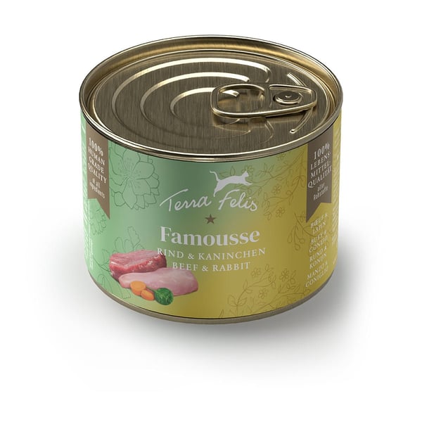 Terra Felis Famousse Rind & Kaninchen wird aus Rohstoffen in 100% Lebensmittelqualität hergestellt. Die spezielle Rezeptur enthält über 90% frisches Muskelfleisch und wertvolle Innereien, die perfekt auf die natürlichen Bedürfnisse von Katzen abgestimmt sind. Diese hochwertige Zusammensetzung sorgt für ein unverwechselbares Aroma, das Katzen lieben.