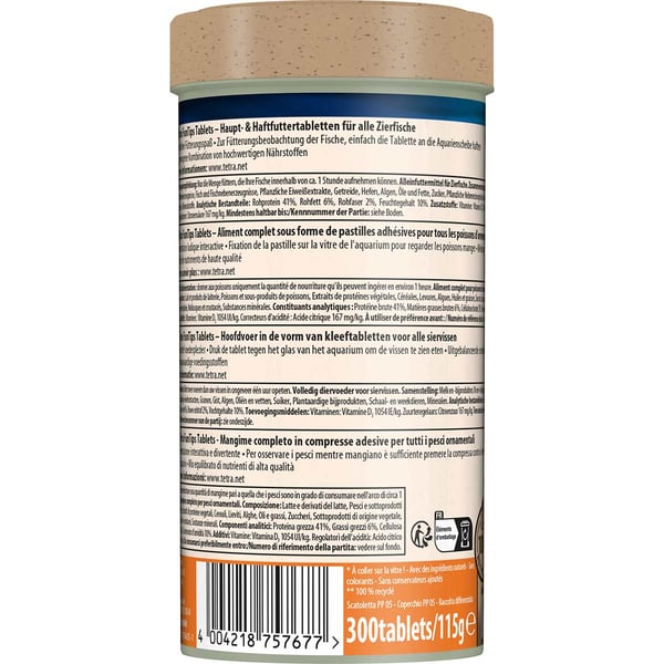 Die FunTips Tablets gehören zum Fischfuttersortiment von Tetra und versprechen eine für alle Parteien zufriedenstellende Fütterung: Die Fische erhalten eine nahrhafte, schmackhafte Mahlzeit und Sie können Ihre Lieblinge beim Verspeisen beobachten. Um diese Ansprüche gleichermaßen zu erfüllen handelt es sich bei diesen Futtertabletten um Hafttabletten, die an Scheiben oder Dekoelementen haften. Dabei enthalten sie einen Mix aus hochwertigen Flocken und nahrhaftem Naturfutter, welches mit Brine Shrimps, Krill, Gammarus und Daphnien über 20 % des Futters ausmacht. Zudem ist die Tablette in zwei Seiten aufgeteilt: Während die orangene Hälfte Carotinoide zur natürlichen Verstärkung der Farbenpracht Ihrer Fische enthält, liefert die grüne Seite pflanzliche Zutaten zur Förderung der Gesundheit und Vitalität.