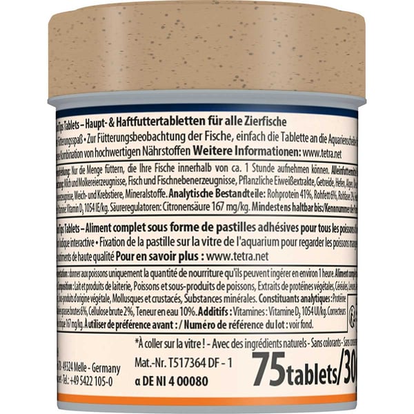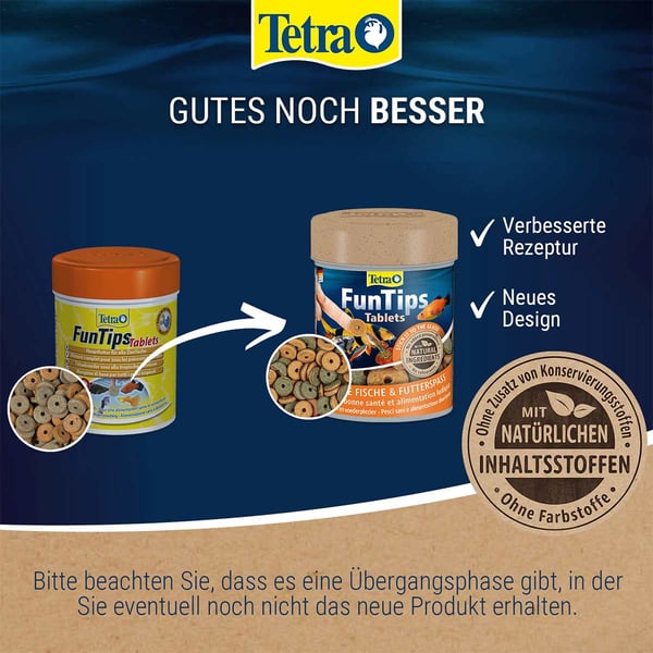 Die FunTips Tablets gehören zum Fischfuttersortiment von Tetra und versprechen eine für alle Parteien zufriedenstellende Fütterung: Die Fische erhalten eine nahrhafte, schmackhafte Mahlzeit und Sie können Ihre Lieblinge beim Verspeisen beobachten. Um diese Ansprüche gleichermaßen zu erfüllen handelt es sich bei diesen Futtertabletten um Hafttabletten, die an Scheiben oder Dekoelementen haften. Dabei enthalten sie einen Mix aus hochwertigen Flocken und nahrhaftem Naturfutter, welches mit Brine Shrimps, Krill, Gammarus und Daphnien über 20 % des Futters ausmacht. Zudem ist die Tablette in zwei Seiten aufgeteilt: Während die orangene Hälfte Carotinoide zur natürlichen Verstärkung der Farbenpracht Ihrer Fische enthält, liefert die grüne Seite pflanzliche Zutaten zur Förderung der Gesundheit und Vitalität.