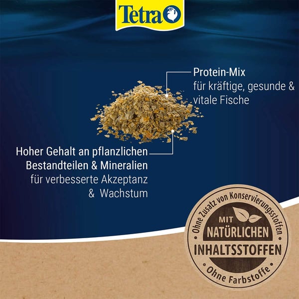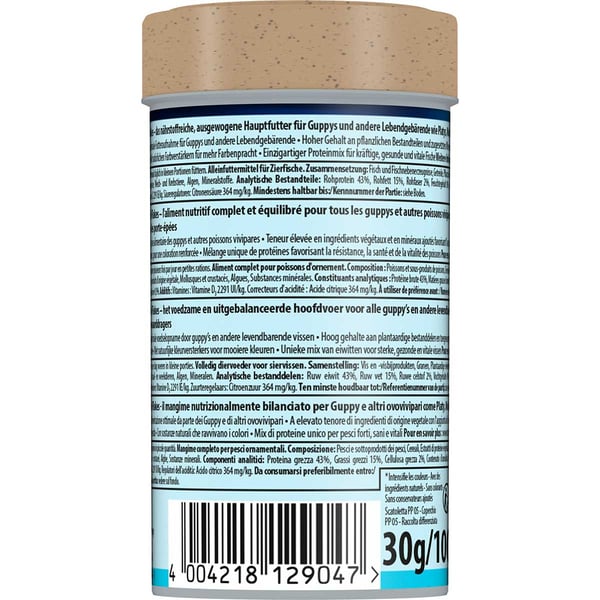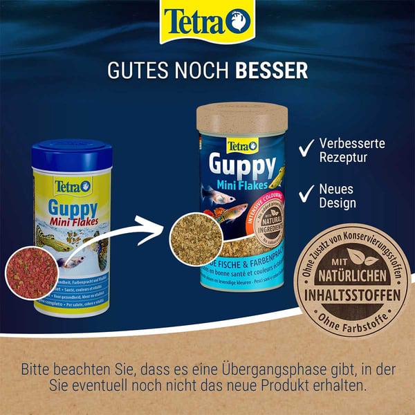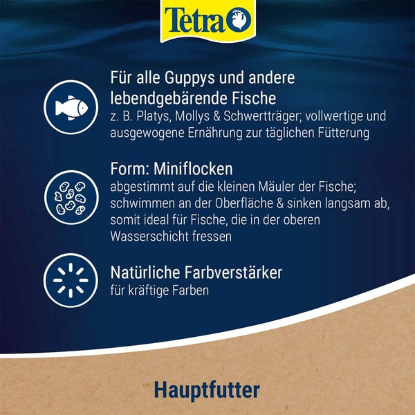 TetraGuppy ist ein Hauptfutter für Guppys und andere lebendgebärende Zahnkarpfen. Dieses Hauptfutter bringt die natürliche Farbenpracht zur vollen Entfaltung und fördert die Vitalität. Zudem enthält es natürliche Farbverstärker speziell über die Anteile in Garnelen und Spirulina-Algen.