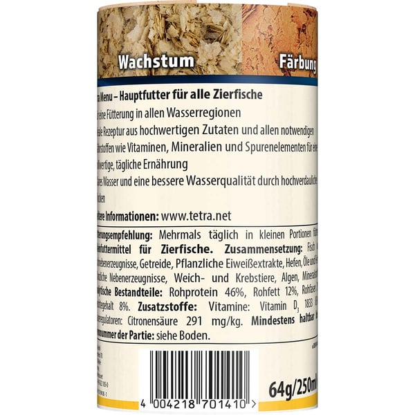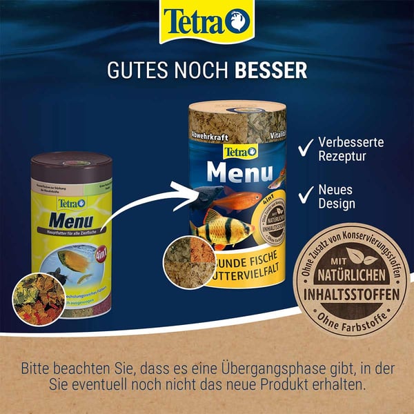 TetraMenü ist ein Futtermix aus 4 verschiedene Flocken in 4 getrennten Kammern für mehr Spaß beim Füttern. Es enthält in vier getrennten Dosenfächern je eine Flockenart: gelbe Flocken lassen die Fische gesund wachsen, braune Flocken erhöhen die Widerstandsfähigkeit, grüne Flocken machen vital und rote Flocken verbessern die Fruchtbarkeit. Somit ist eine gezielte wahlweise Fütterung von Kraftnahrung, Wachstums- und Vitalitätsfutter sowie Pflanzenkost möglich.