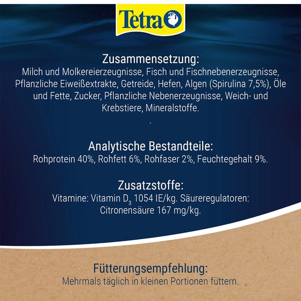 Füttern Sie nur die Menge, die ihre Fisch innerhalb von ca. 30 Minuten aufnehmen können. Verwenden Sie die Tabletten in Gesellschaftsbecken zusammen mit TetraMin Flakes/Granules oder TetraPro. Für die abwechslungsreiche Ernährung Ihrer Fische füttern Sie 2 bis 3 Mal pro Woche Tetra Delica.